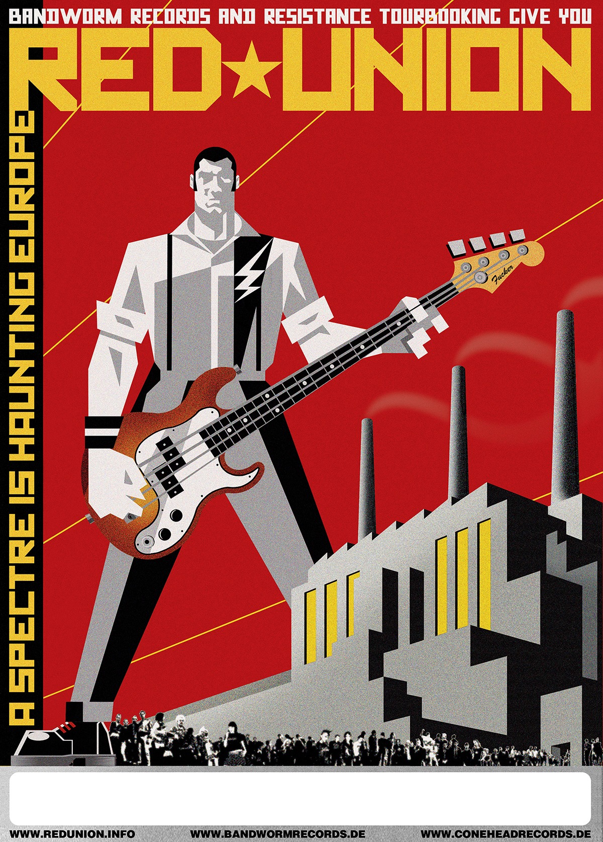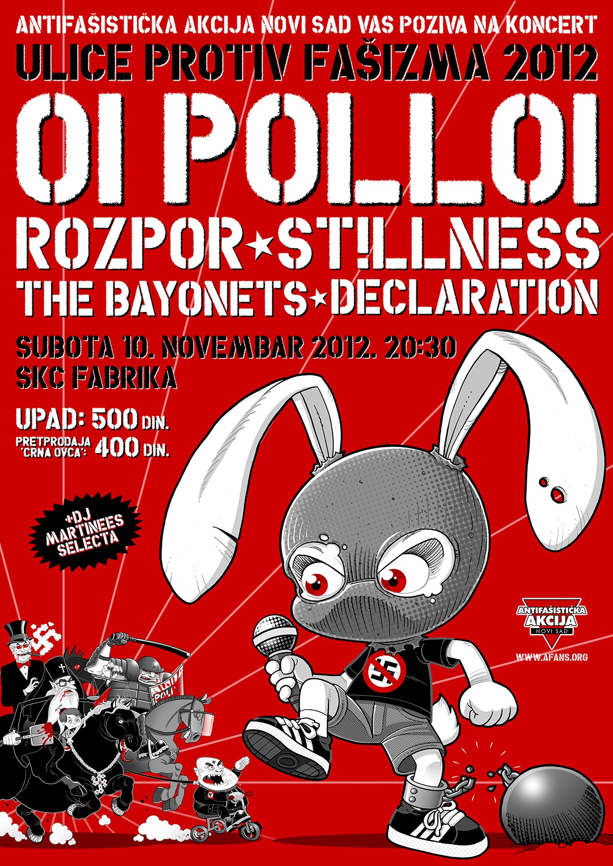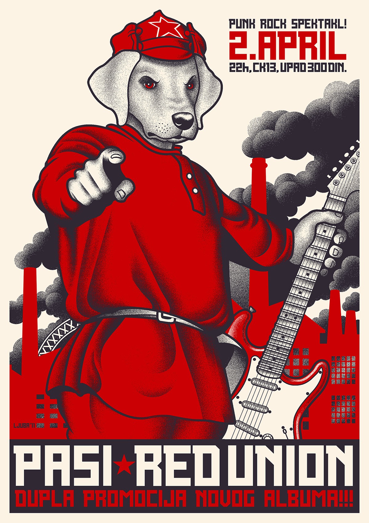 Ljuba: Recimo Dropkick Murphys u Budimpešti 2001, kad su po mom mišljenju bili na kreativnom vrhuncu i još nisu skroz skliznuli u narodnjaštvo, Hivesi na Exitu, The Damned oba puta u Novom Sadu, Newtown Neuroticsi 2017 na To Be Punku, pa The Living End par dana kasnije u Berlinu (to je više od tri, ali jebiga, ovakva pitanja su uvek zajebana). Za koncerte koje sam svirao sam već manje-više rekao, od dizajna kvazi-sovjetski plakat za turneju Red Uniona 2008, plakat za svirku RU sa Pasima, par plakata za Ulice protiv fašizma…